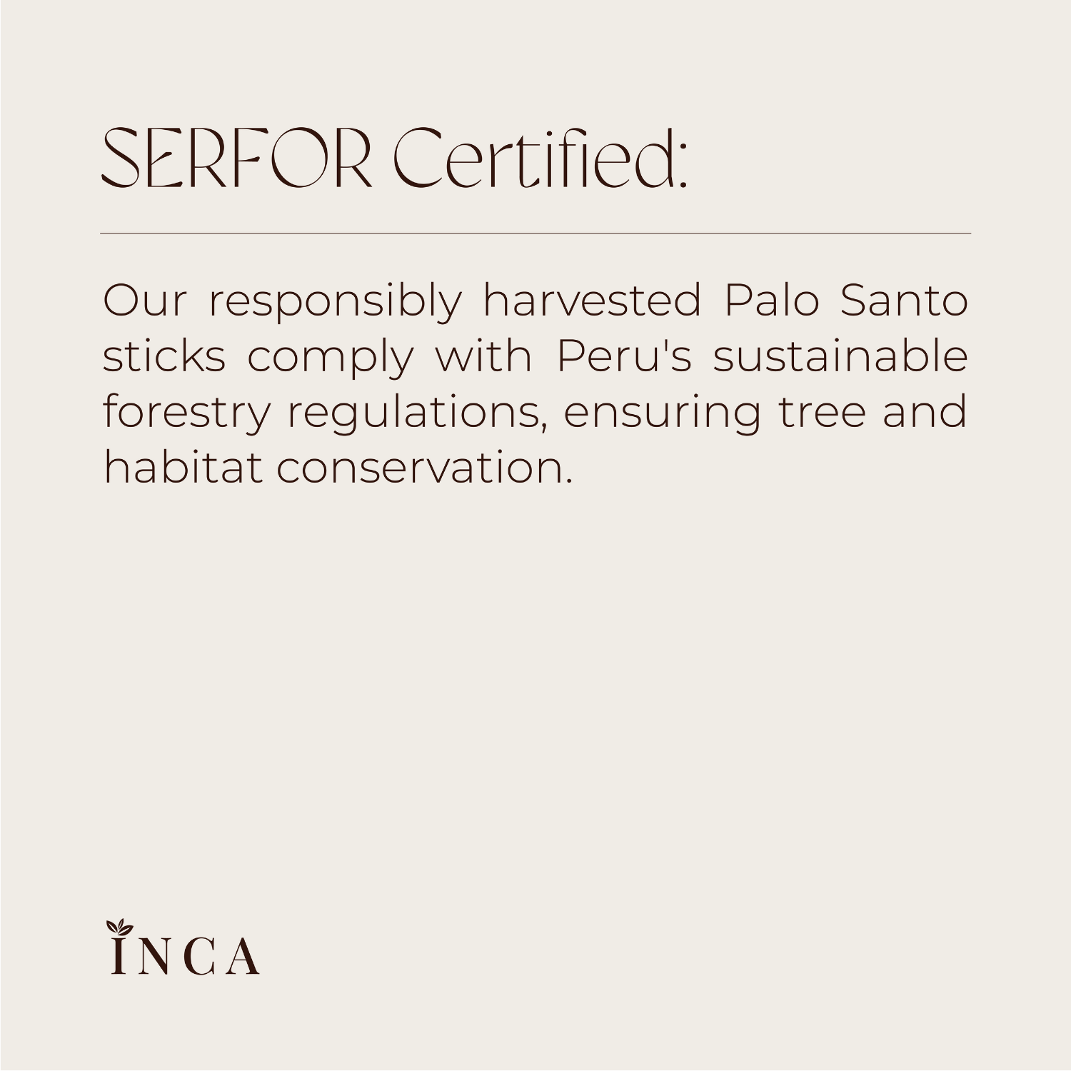 Our Palo Santo sticks are responsibly collected in accordance with Peru’s National Forestry Service (SERFOR) regulations. This ensures ethical, sustainable management of Palo Santo trees and long-term conservation of native forests.