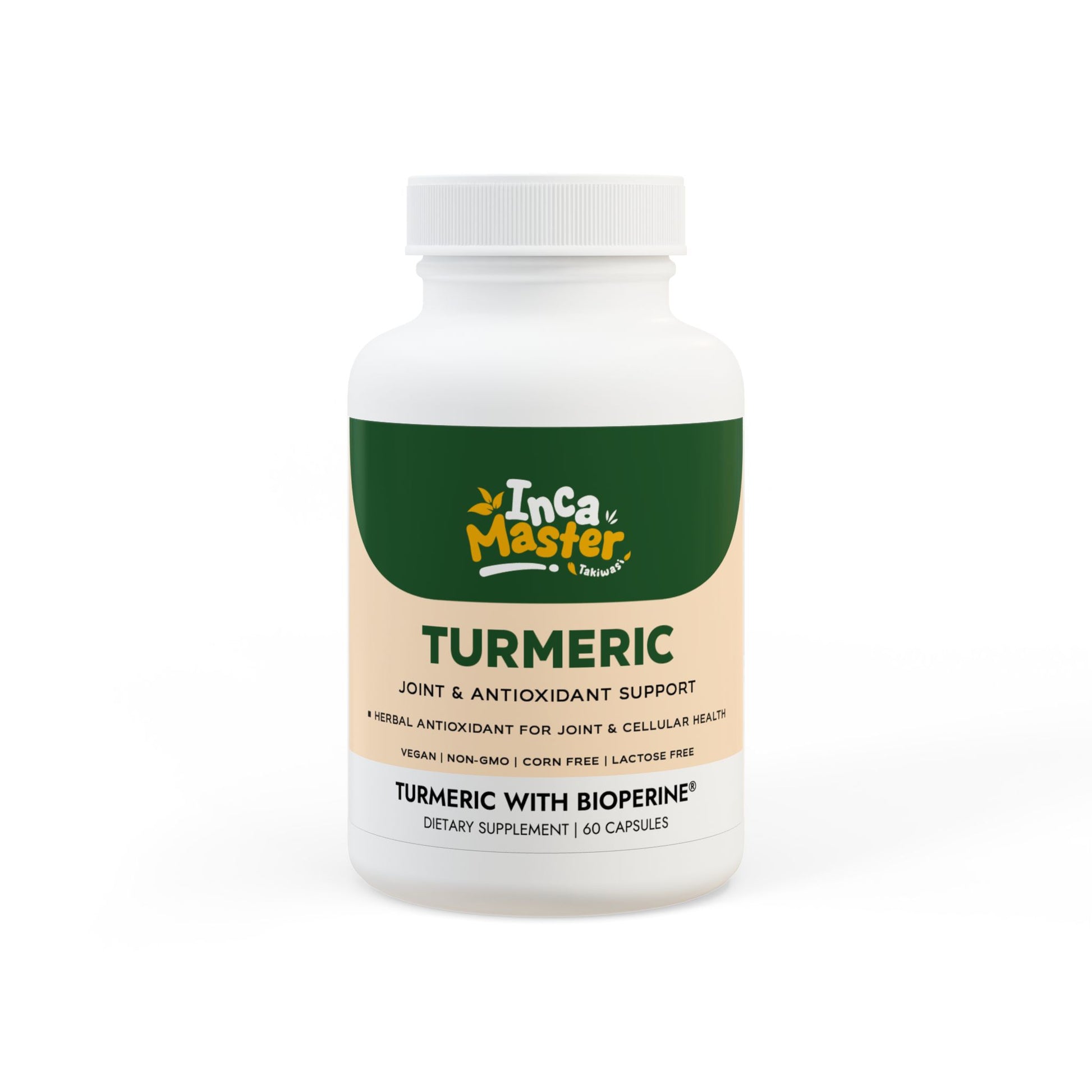 The Turmeric and BioPerine® (Black Pepper Fruit Extract) supplement supports recovery from exercise, provides antioxidant support, enhances muscle function, and increases the effect of physical exercise. Key ingredients include Turmeric (Curcuma Longa) root, Turmeric 95% Curcuminoids, and BioPerine® (Black Pepper Fruit Extract).