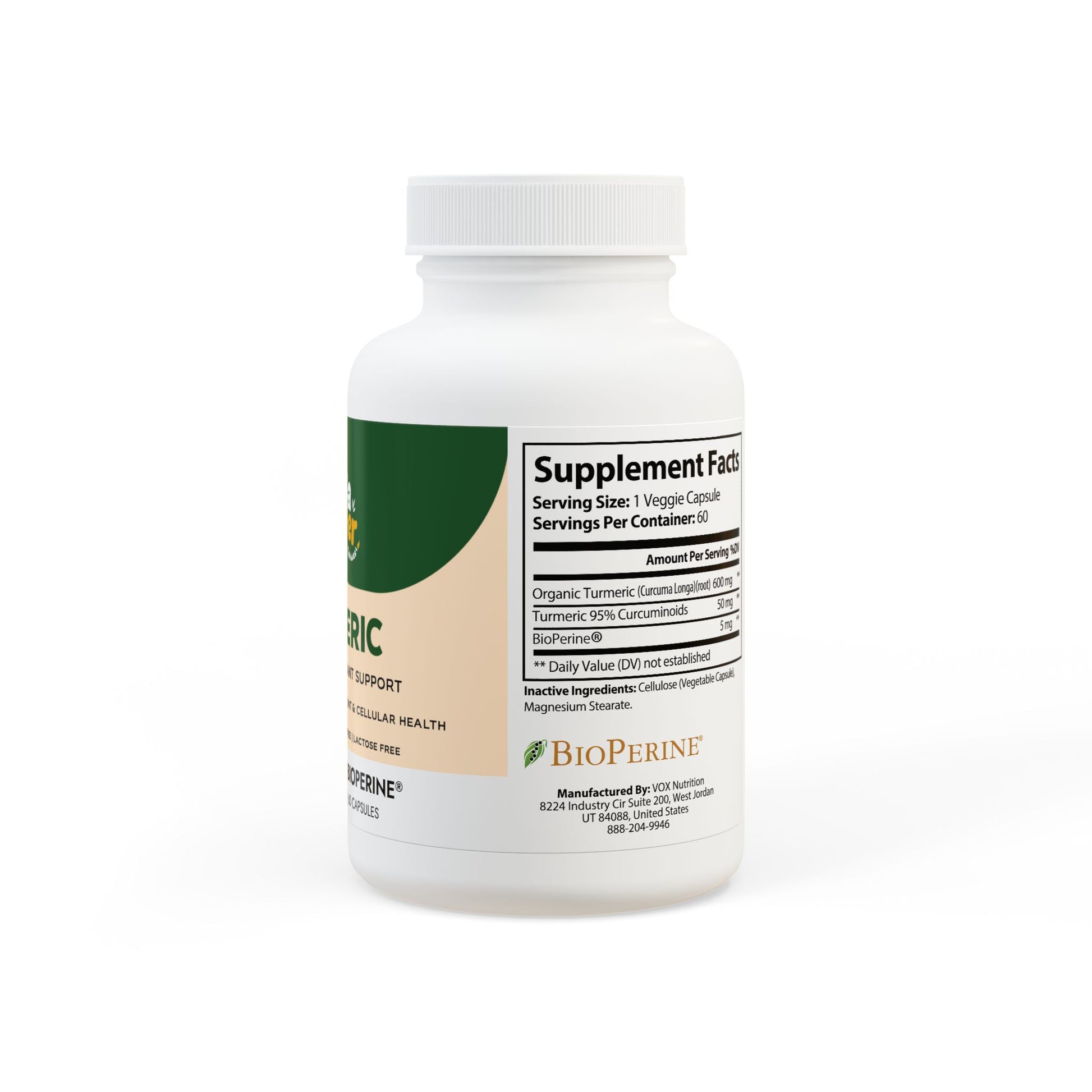 Ingredients: Organic Turmeric (Curcuma Longa)(root), Turmeric 95% Curcuminoids, BioPerine. Inactive Ingredients: Cellulose (Vegetable Capsule), Magnesium Stearate.